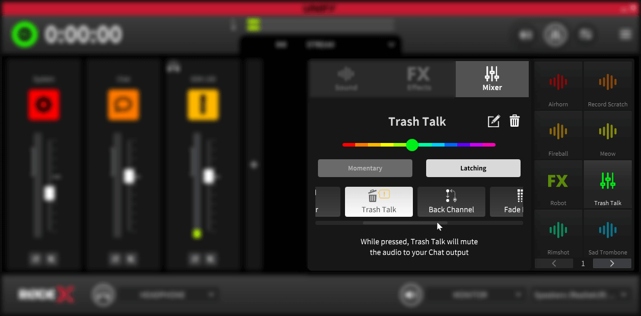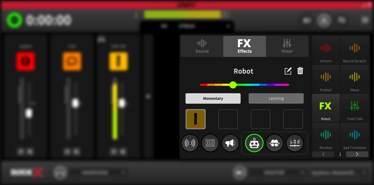 Voice effects pads can either remain triggered when clicked, staying activated until they are clicked again, or they can just be activated by holding down the mouse button. See below for more details on configuring the pads.