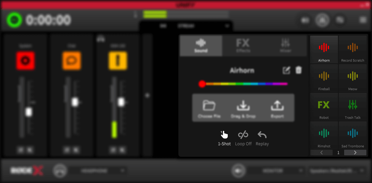 Pads are triggered by clicking on them. There are three pad functions – sound playback, voice effects and mixer actions.